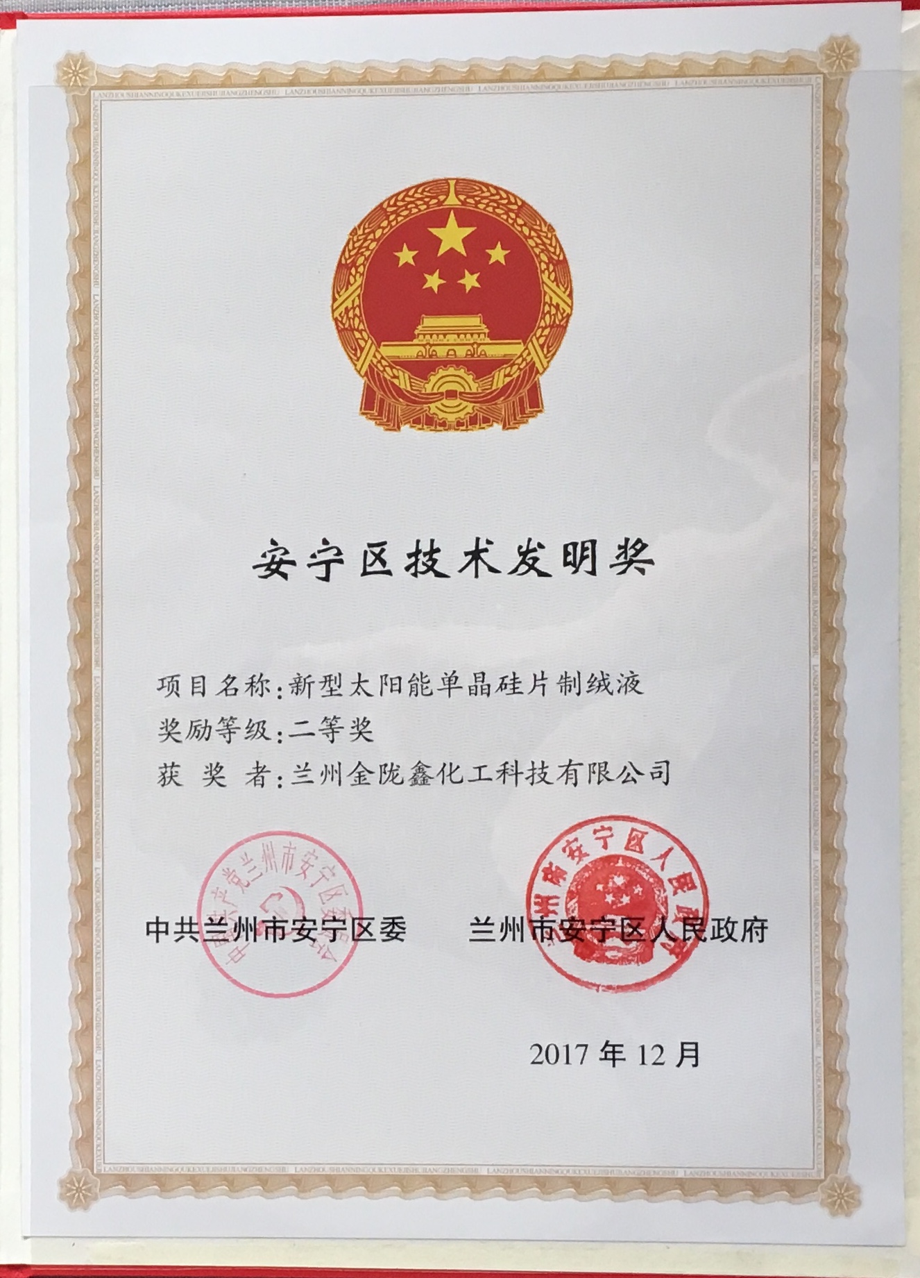 恭喜我公司項目《新型太陽能單晶硅片制絨液》獲得安寧區科技發明獎二等獎,同時感謝技術部全體人員為公司的發展所做出的巨大貢獻。希望你們再接再厲創造更大的輝煌!